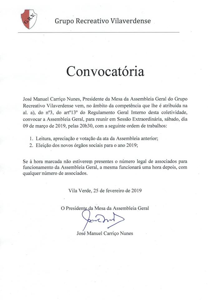 9 de março de 2019, 20H30 Convocatória Assembleia Geral Extraordinária